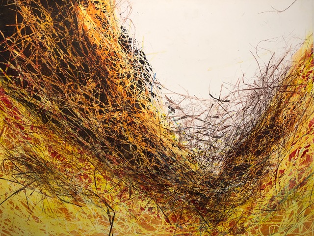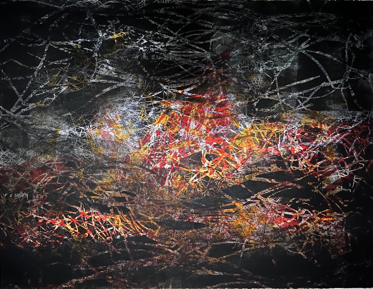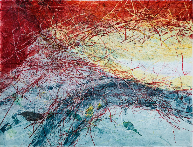 My monotypes and drawings reflect natural phenomena. I engage line as a metaphor — lines that repeat and weave themselves together, lines that echo the flow of a river, the growth of tree bark, or the sway of grass. I am intrigued by the endless possibilities of line: the twists and intertwines, the overlaps and tangles, the random disarray, or seemingly organized structures. The strands of color are fragile alone but gain power when integrated with others. The energy, spatial qualities, textures, forms that emerge are indicative of the natural world.
