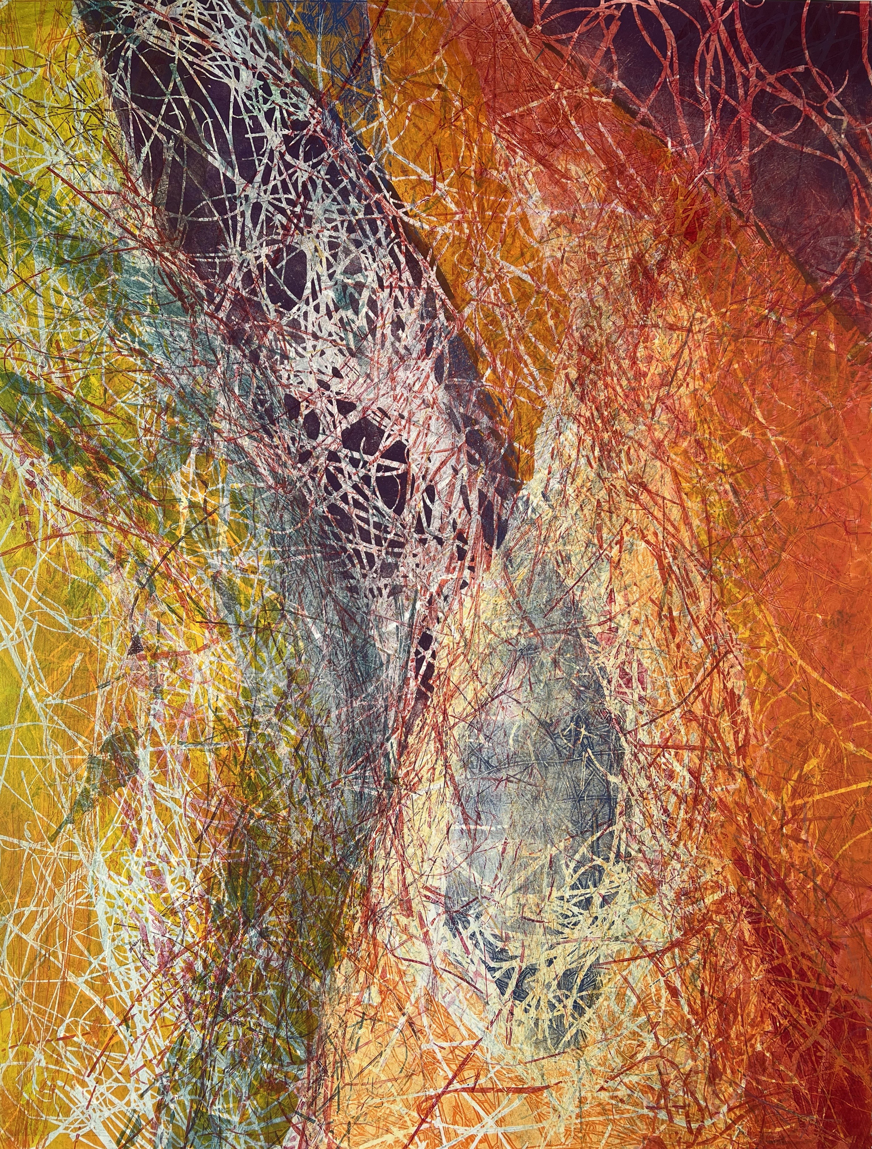 My monotypes and drawings reflect natural phenomena. I engage line as a metaphor — lines that repeat and weave themselves together, lines that echo the flow of a river, the growth of tree bark, or the sway of grass. I am intrigued by the endless possibilities of line: the twists and intertwines, the overlaps and tangles, the random disarray, or seemingly organized structures. The strands of color are fragile alone but gain power when integrated with others. The energy, spatial qualities, textures, forms that emerge are indicative of the natural world.